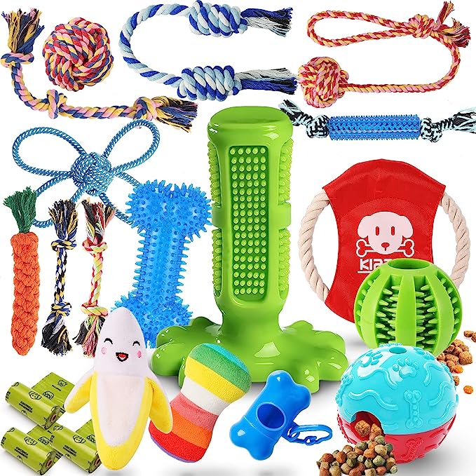 KIPRITII Dog Chew Toys for Puppy – 20 Pack Puppies Teething Chew Toys for Boredom, Pet Dog Toothbrush Chew Toys with Rope Toys, Treat Balls and Dog Squeaky Toy for Puppy and Small Dogs