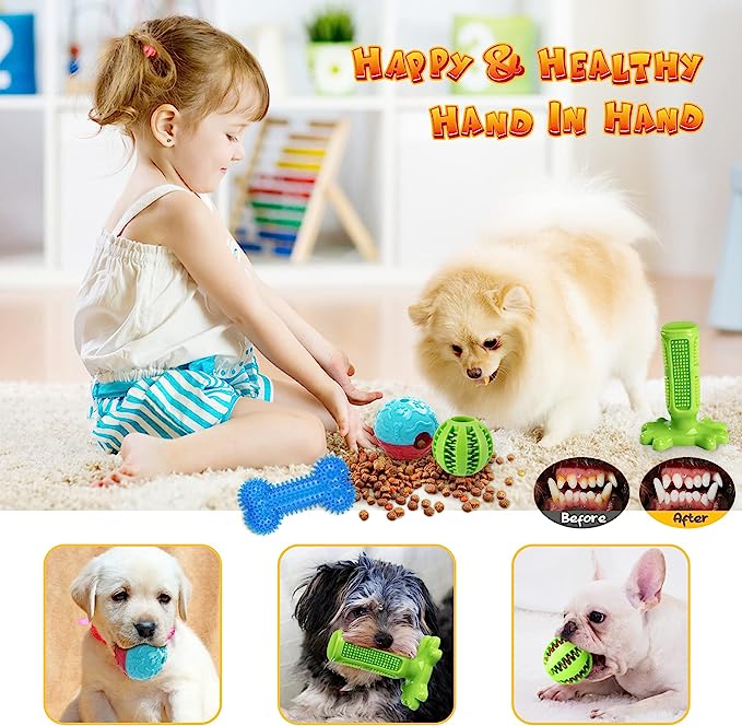 • Dog Toy & Super Fun: 20 Pack pet toys for dogs, great for puppy and small dogs. Includes 9 rope dog toys, 2 dog treat balls, 1 rubber dog toothbrush stick, 1 banana dog toy, 1 squeaky plush toys, 1 rubber toys, 1flying disc dog toy and 3 extra dog bag rolls & 1 bag dispenser as a gift. You are not merely buying puppy toys, but helping him stays happy and healthy.